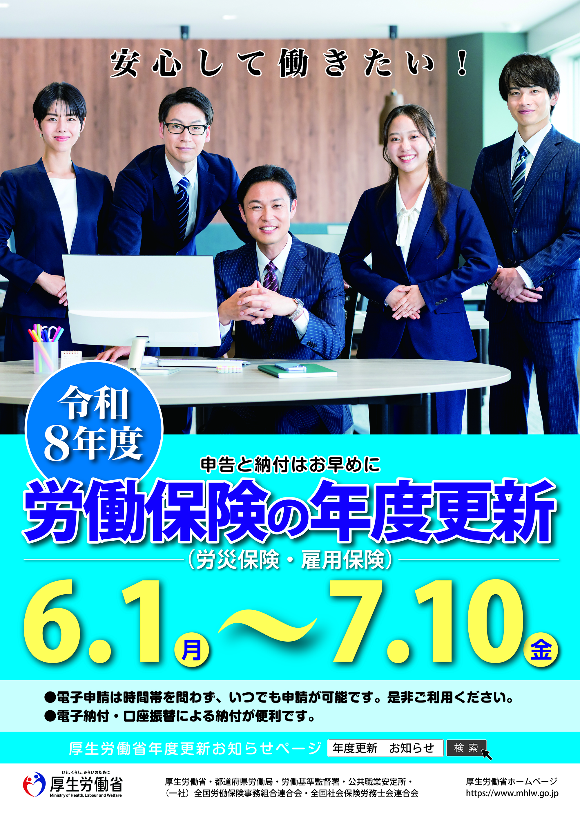 労働保険の概算・確定保険料及び石綿健康被害救済法の一般拠出金の申告・納付をしていただく時期となりました。