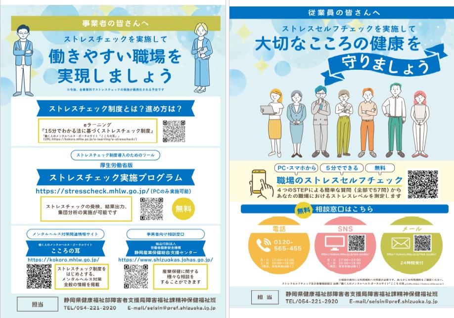 静岡県が作成した下記のストレスチェック広報チラシをご覧いただき、ストレスチェック制度の周知と導入にご理解をいただきたくお願い申し上げます。