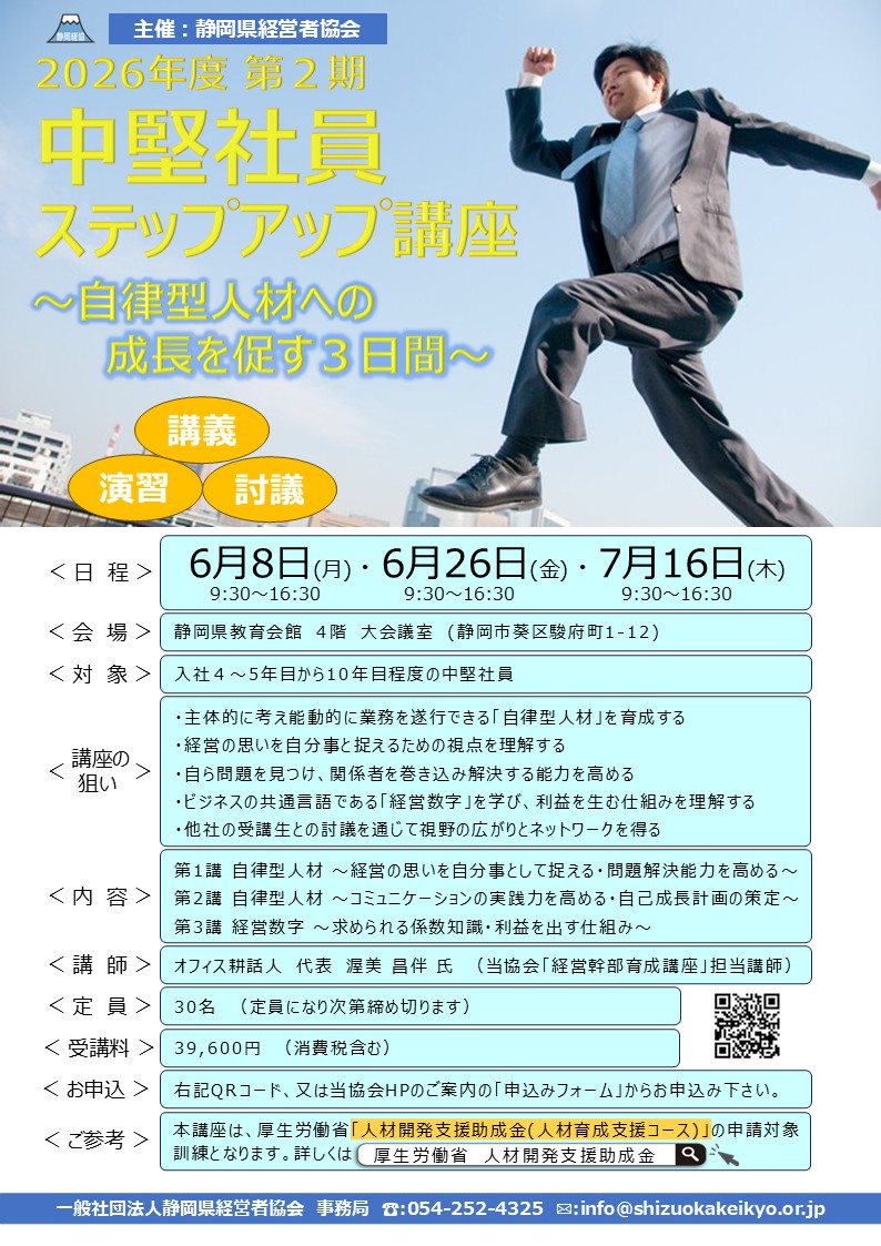 ◆日程 【第1講】2026年 6月 8日(月) 【第2講】2026年 6月26日(金) 【第3講】2026年 7月16日(木) いずれも9:30~16:30 ◆会場 静岡県教育会館 4階 大会議室 (静岡市葵区駿府町1-12) ◆対象 入社4~5年目から10年目程度の中堅社員 |
