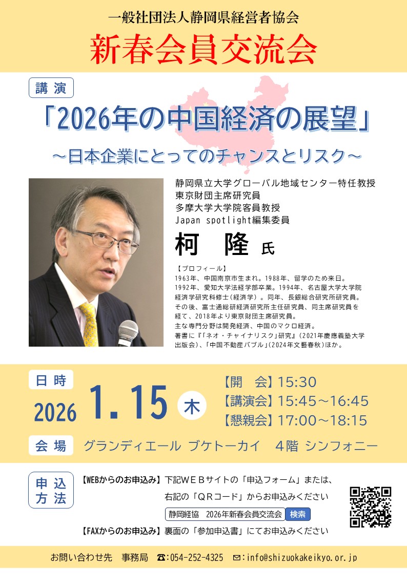 ◆日時 2026年1月15日(木) 15:30〜18:15 ◆会場 グランディエールブケトーカイ 4階 「シンフォニー」 ◆内容 <挨 拶> 15:30~15:45 会長挨拶 (一社)静岡県経営者協会 会長 柴田 久 来賓挨拶 静岡県知事 鈴木 康友 氏 <講 演 会> 15:45~16:45 <演題> 「2026年の中国経済の展望」 ~ 日本企業にとってのチャンスとリスク ~ |