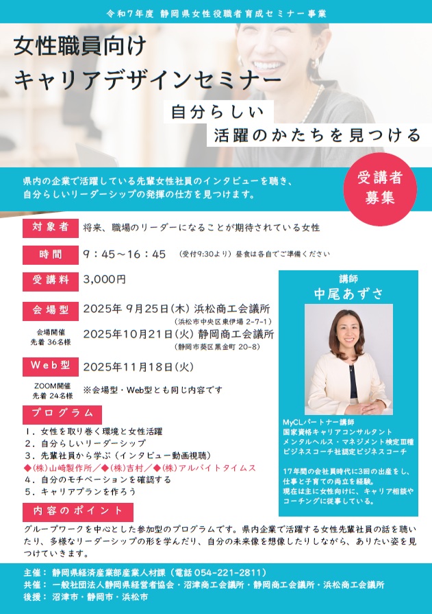 ◆対象 将来、職場のリーダーになることが期待されている女性 ◆開催日・会場・定員 【会場型】 定員 各回 先着 36名 9月25日(木) 浜松商工会議所 10月21日(火) 静岡商工会議所 【Web型】 定員 先着 24名 11月18日(火) Zoom開催 <講師> 会場・Web共に 中尾 あずさ 氏 MyCLパートナー講師、国家資格キャリアコンサルタント メンタルヘルス・マネジメント検定Ⅲ種 ビジネスコーチ社認定ビジネスコーチ |