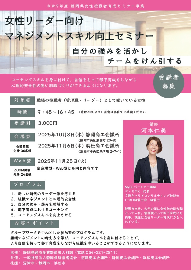 ◆対象 職場の役職者(管理者・リーダー)として働いている女性 ◆開催日・会場・定員 【会場型】 定員 先着 36名 10月 8日(水) 静岡商工会議所 11月 6日(木) 浜松商工会議所 【Web型】 定員 先着 24名 11月25日(火) Zoom開催 <講師> 会場・Web共に 河本 仁美 氏 MyCLパートナー講師、ケ・セラK 代表 2級キャリアコンサルティング技能士、(一社)経営士会 経営士 |