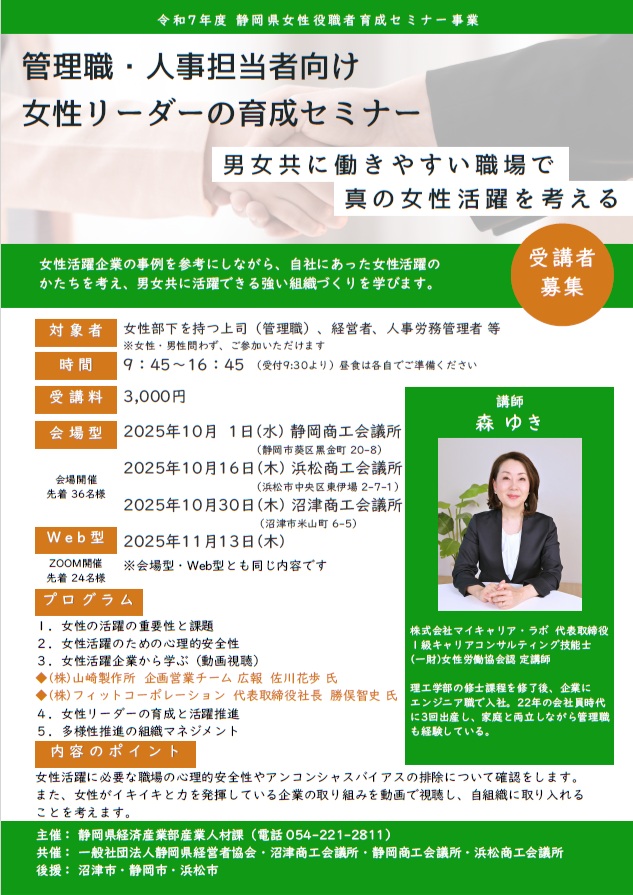◆対象 女性部下を持つ上司(管理職)、経営者、人事労務管理者 等 (女性・男性問わず、ご参加いただけます) ◆開催日・会場・定員 【会場型】 定員 先着 36名 10月 1日(水) 静岡商工会議所 10月16日(木) 浜松商工会議所 10月30日(木) 沼津商工会議所 【Web型】 定員 先着 24名 11月13日(木) Zoom開催 <講師> 会場・Web共に 森 ゆき 氏 |