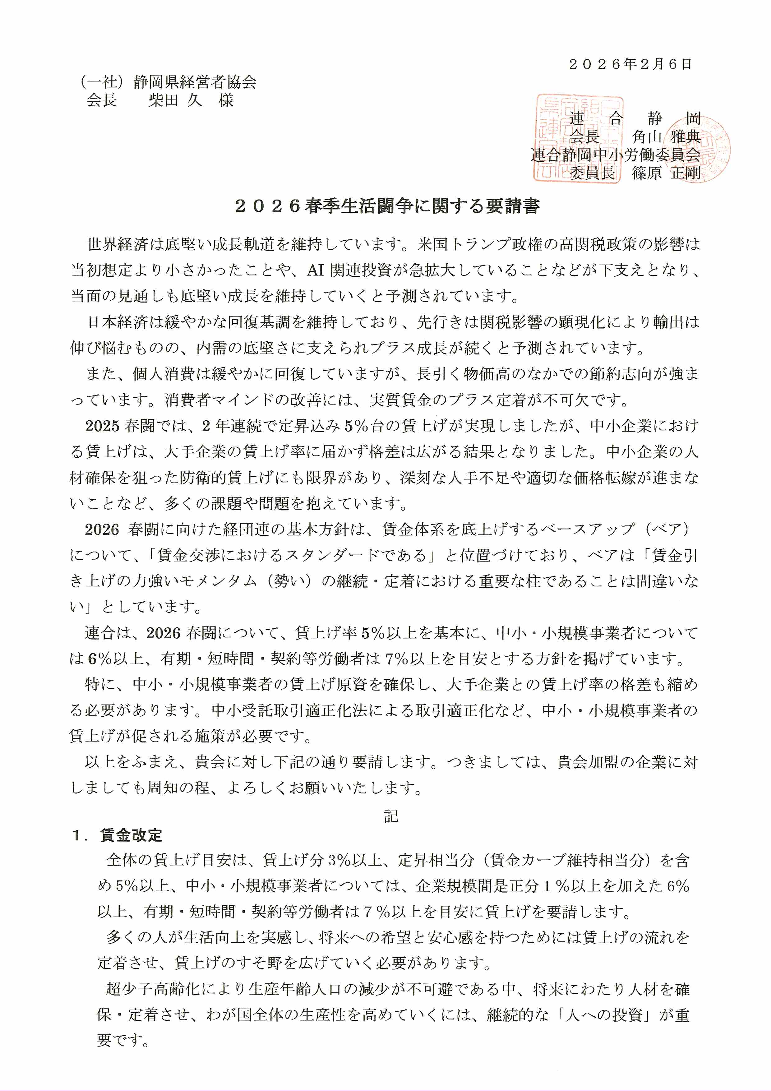 2月6日(金)、2026年の春闘のスタートに当たり連合静岡より「2026春季生活闘争に関する要請書」を受理しました。