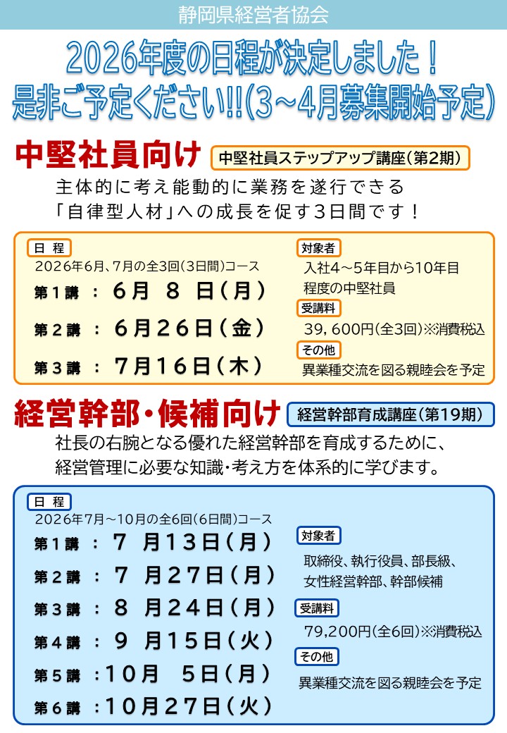 例年好評をいただいております、標記当協会主催講座の2026年度講座日程が決定しましたので、会員の皆様にご案内いたします。