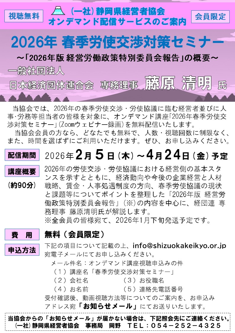 当協会では、2026年の春季労使交渉・労使協議に臨む経営者並びに人事・労務等担当者の皆様を対象に、オンデマンド講座「2026年春季労使交渉対策セミナー」(Zoomウェビナー録画)を無料配信いたします。